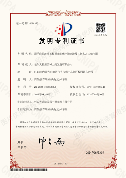近日,【官网】清美申请的“用于曲面玻璃盖板抛光的稀土抛光液及其制备方法和应用”,顺利通过国家知识产权局审查并获得国家发明专利授权(专利号ZL202310965201.4)。这是今年继起草两项稀土抛光粉行业标准正式实施以来,【官网】清美在稀土抛光材料领域实现的又一突破。